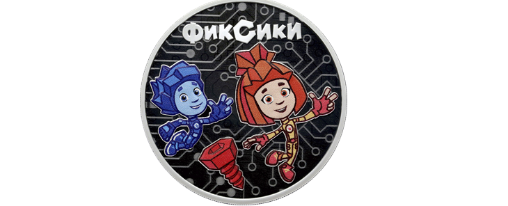 Реверс: монеты из стали с никелевым покрытием (каталожный № 5715-0004) расположено рельефное изображение героев мультсериала «Фиксики», вверху имеется надпись «ФИКСИКИ»