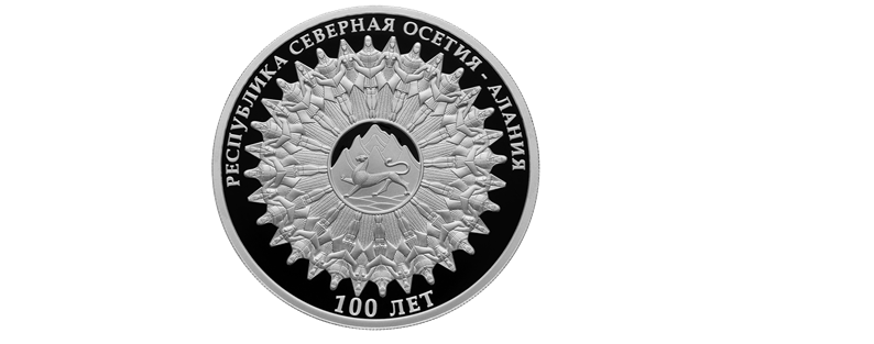 Реверс: рельефное изображение герба Республики Северная Осетия – Алания, окруженного стилизованными изображениями пар, исполняющих хороводный танец «Симд»; по окружности – рельефные надписи: вверху – «РЕСПУБЛИКА СЕВЕРНАЯ ОСЕТИЯ – АЛАНИЯ», внизу – «100 ЛЕТ».