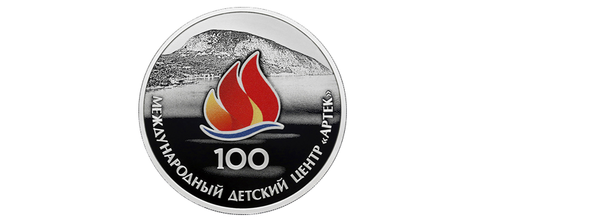 Реверс: выполненный в цвете элемент логотипа Международного детского центра «Артек» на фоне выполненного в технологии лазерного матирования изображения горы Аю-Даг; внизу – рельефные надписи: по окружности – «МЕЖДУНАРОДНЫЙ ДЕТСКИЙ ЦЕНТР «АРТЕК», над ней – «100».