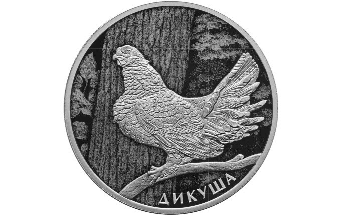 Реверс: рельефное изображение дикуши, сидящей на ветке, на фоне выполненного в технике лазерного матирования изображения лесного пейзажа; внизу по окружности – рельефная надпись «ДИКУША».