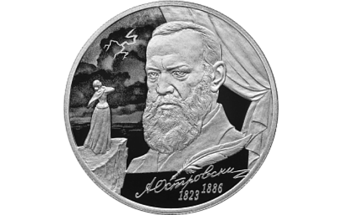 Реверс: рельефное изображение портрета А. Н. Островского на фоне поднятой театральной кулисы; слева — сцена из пьесы «Гроза», выполненная в рельефе и в технологии лазерного матирования; внизу — рельефное изображение пера, факсимиле подписи драматурга и годы его жизни: «1823» и «1886».