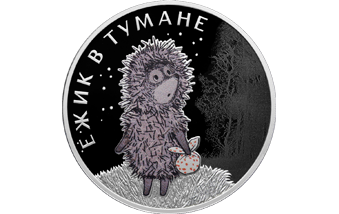 Реверс: выполненное в цвете изображение героя мультфильма «Ежик в тумане», стоящего на холмике, изображение которого выполнено рельефом, на фоне выполненного в технике лазерного матирования пейзажа в тумане; вверху слева по окружности – рельефная надпись «ЕЖИК В ТУМАНЕ».