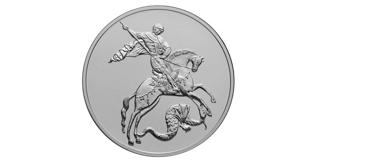 Реверс: изображение Георгия Победоносца верхом на коне, поражающего копьем змея.
