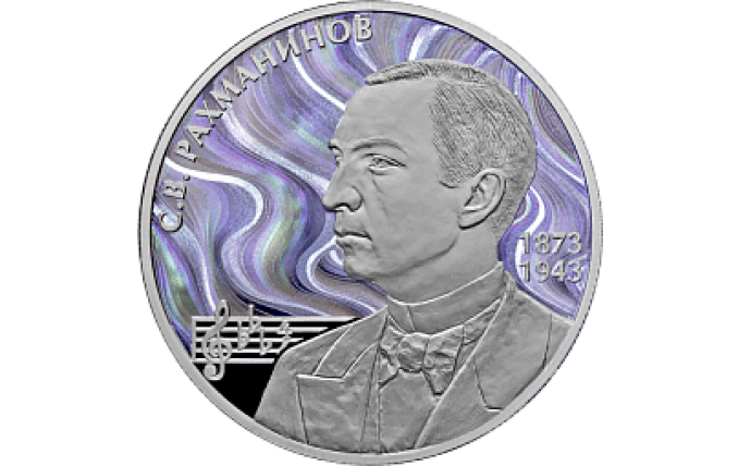 Реверс: рельефные изображения портрета С. В. Рахманинова и нотного стана на стилизованном фоне, представляющем собой композицию волнистых радужных линий с эффектом интерференции света; вверху слева — рельефная надпись: «С. В. РАХМАНИНОВ», справа в две строки — годы жизни композитора: «1873» и «1943».