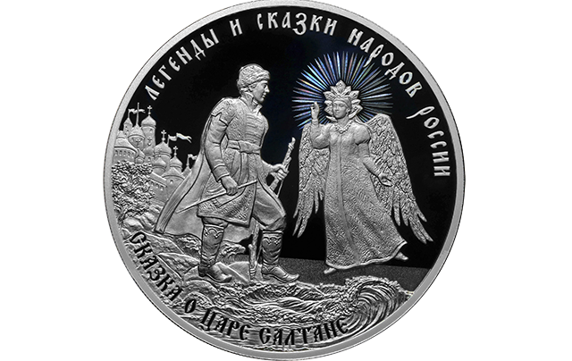 Реверс: рельефные изображения героев сказки А.С. Пушкина – князя Гвидона и царевны Лебедь, города и берега с набегающей волной, а также выполненное в технике лазерного матирования изображение моря; по окружности – надписи: вверху – «ЛЕГЕНДЫ И СКАЗКИ НАРОДОВ РОССИИ», внизу слева – «СКАЗКА О ЦАРЕ САЛТАНЕ»; сияние вокруг головы царевны выполнено с эффектом интерференции света.